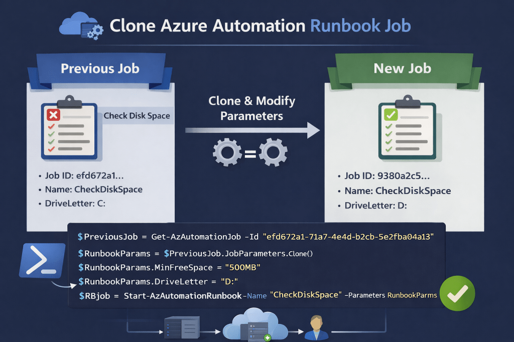 This approach is extremely useful , especially when a runbook failed due to temporary issues or incorrect input. Instead of manually reconstructing all parameters, the script clones the previous job configuration and lets you selectively adjust only what needs to change.